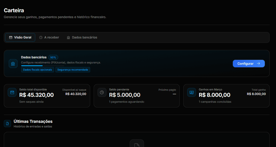 Campanhas, mensagens, entregáveis e notas fiscais. Tudo centralizado para a sua equipe focar na estratégia.